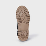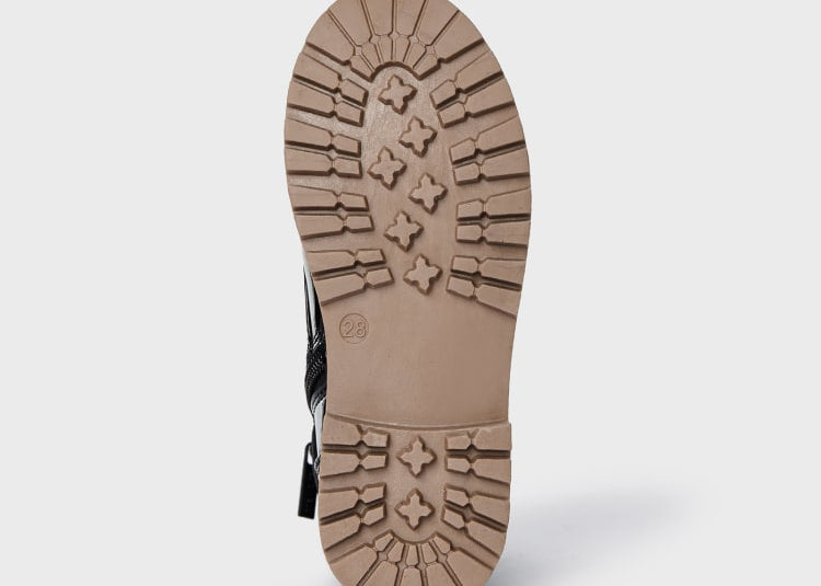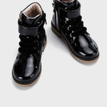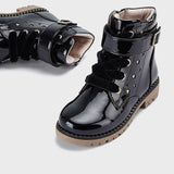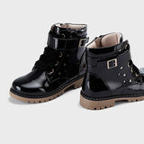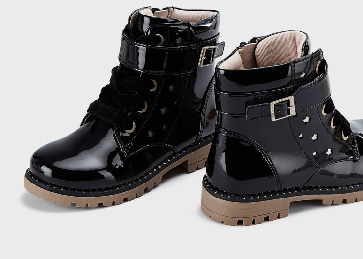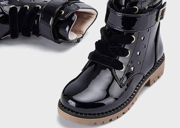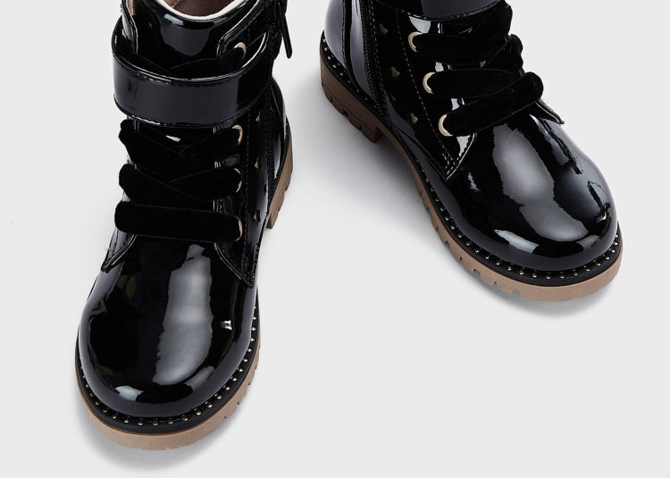 Παιδικά μποτάκια Biker από τη Mayoral σε μαύρο λουστρίνι χρώμα. Διαθέτουν φερμουάρ για εύκολη εφαρμογή, βελούδινα κορδόνια καθώς και βαμβακερό εσωτερικό πατάκι.