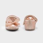 Μπαρέτες για κορίτσι με κλασικό και διαχρονικό στυλ, ιδανικές για κομψό ντύσιμο.  Παπούτσι με φόδρα εσωτερικά και δερμάτινο πάτο. Όλα τα παπούτσια είναι κατασκευασμένα από δέρμα χωρίς χρώμιο. Ελαφριά και εύκαμπτη σόλα. Κλείνει με ρυθμιζόμενο βέλκρο για άψογη εφαρμογή στο πόδι. Διακοσμητικός φιόγκος. Λεπτομέρεια γκλίτερ.